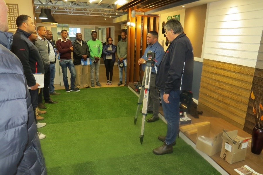 Randall Gaffoor from Robert Bosch SA, illustrating the use of Bosch’s laser level.