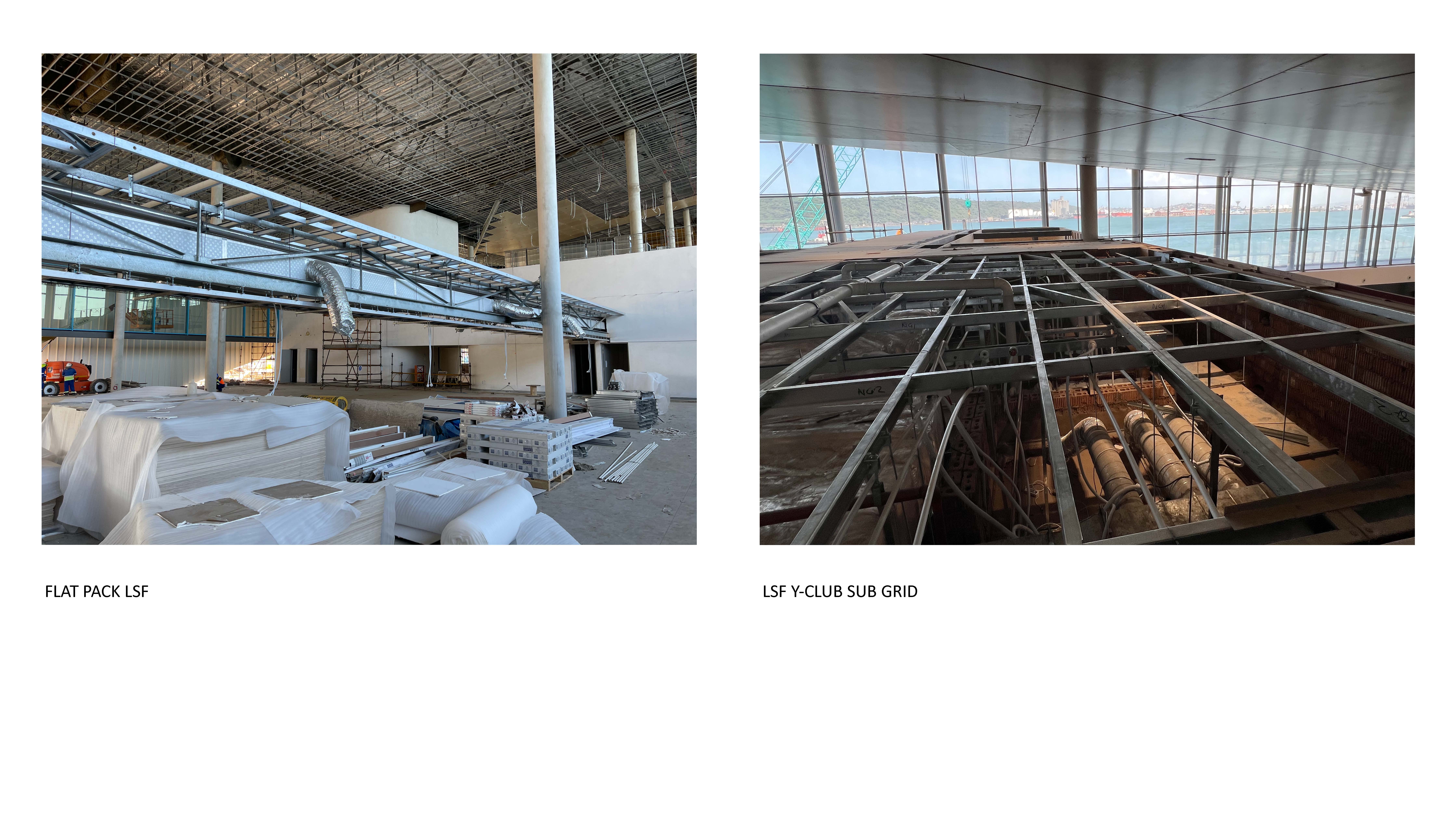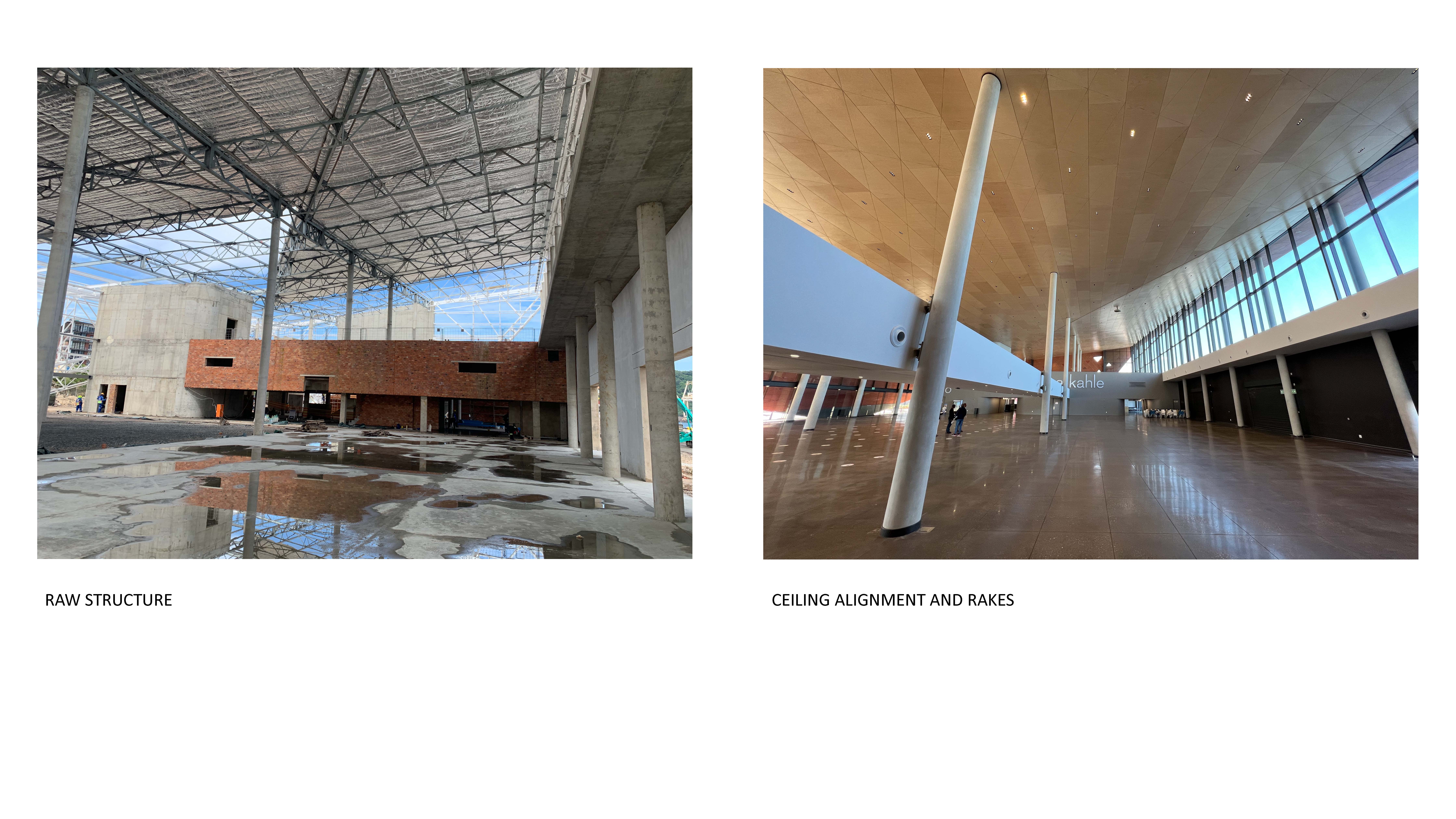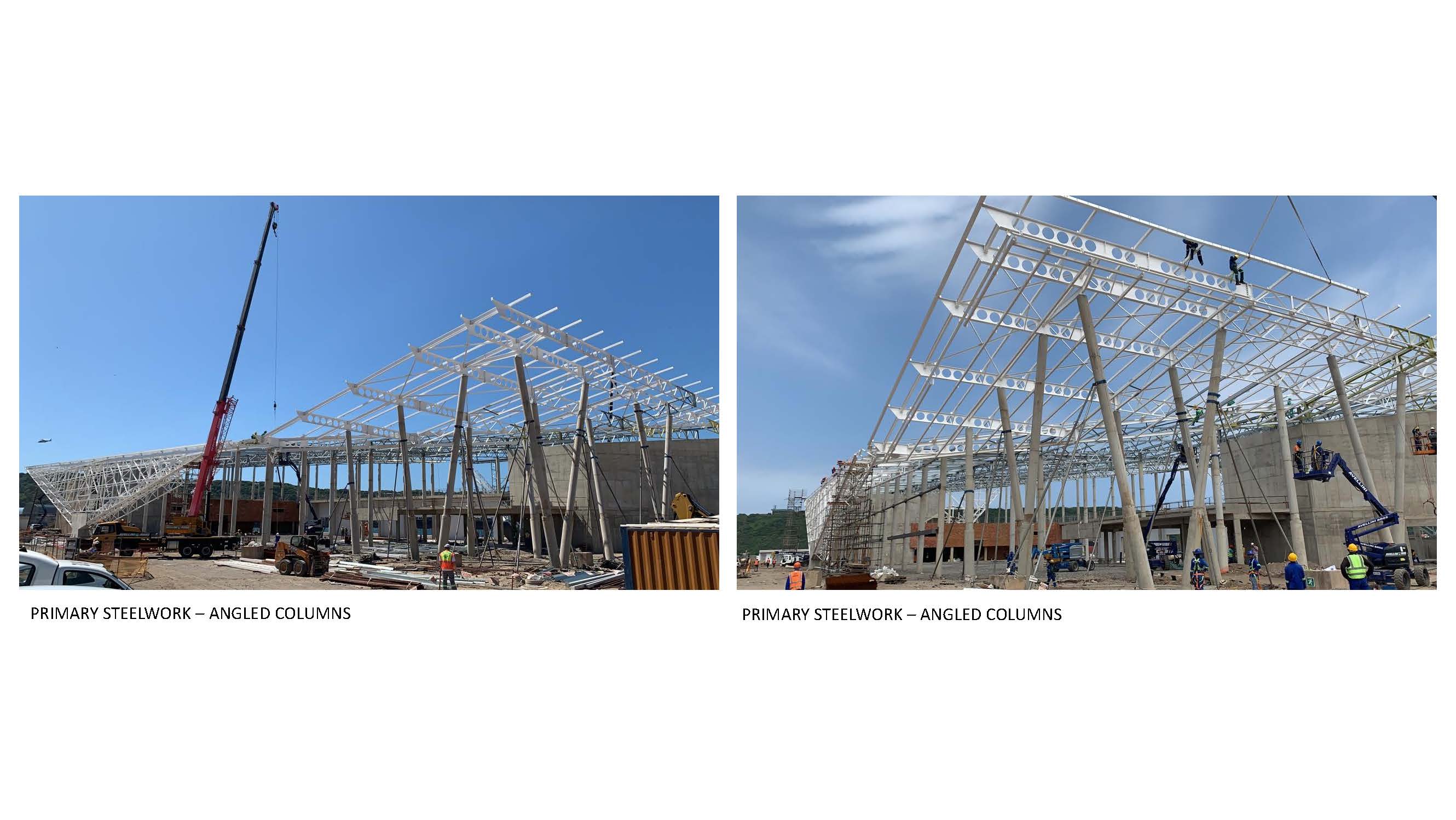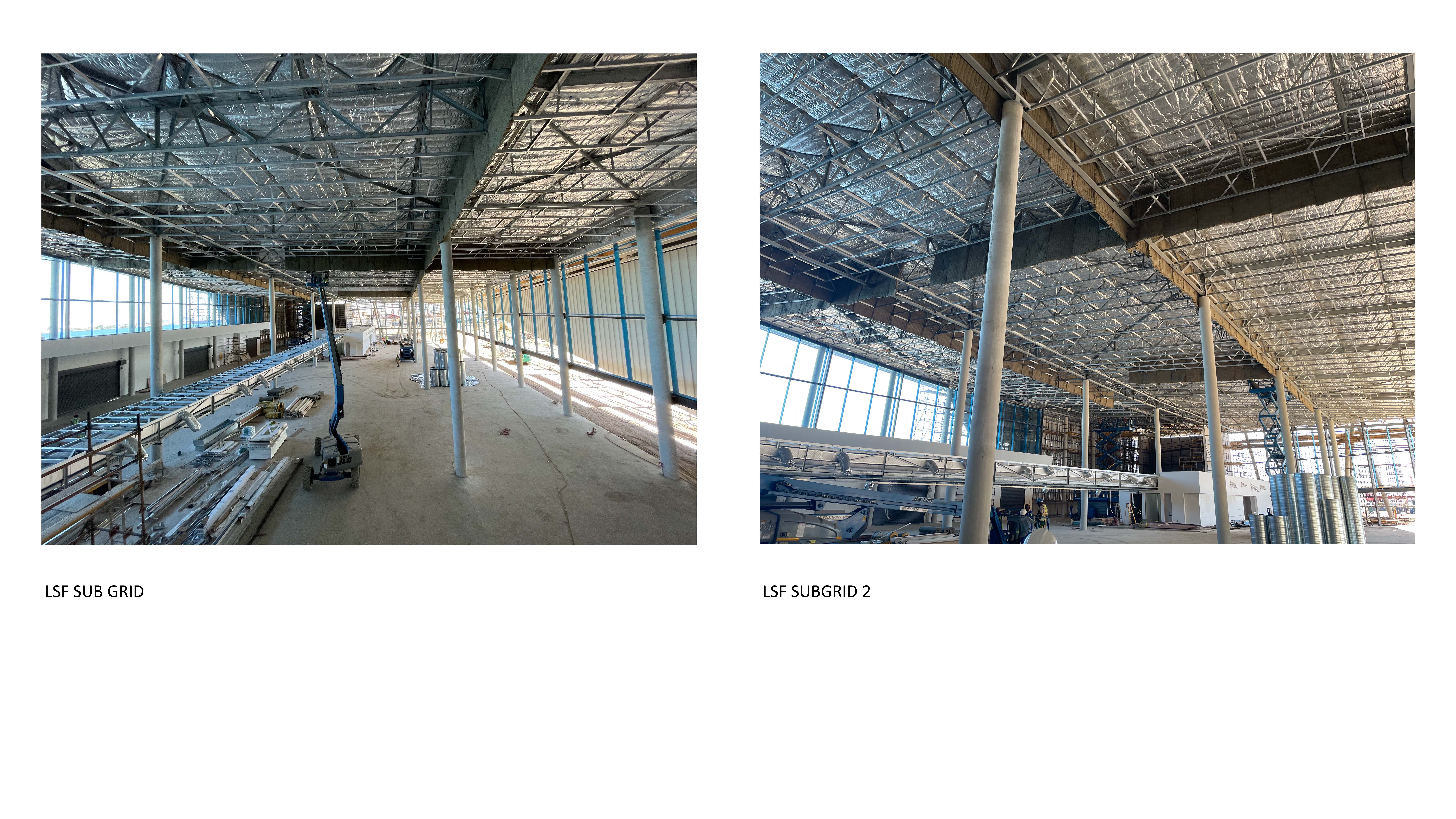 • Light steel frame 90x40x0,9m LSF sub grid 10 KM of steel 4500m2 The terminal's steel-intensive construction presented a host of logistical challenges. Installing the massive box girders that formed the cantilever required specialised rigging equipment and careful alignment to integrate with the concrete "anvil" structure. Positioning the raking columns, each at a different angle, demanded meticulous precision to ensure a seamless fit with the primary roof framing. At height, the team utilised extensive scaffolding and high-reach machinery to safely manoeuvre and secure the steel components. Throughout, the need for exceptional coordination between trades was paramount, as any misalignment could jeopardise the building's structural integrity and weatherproofing. Overcoming these complexities, the contractors delivered an impressive steel installation.