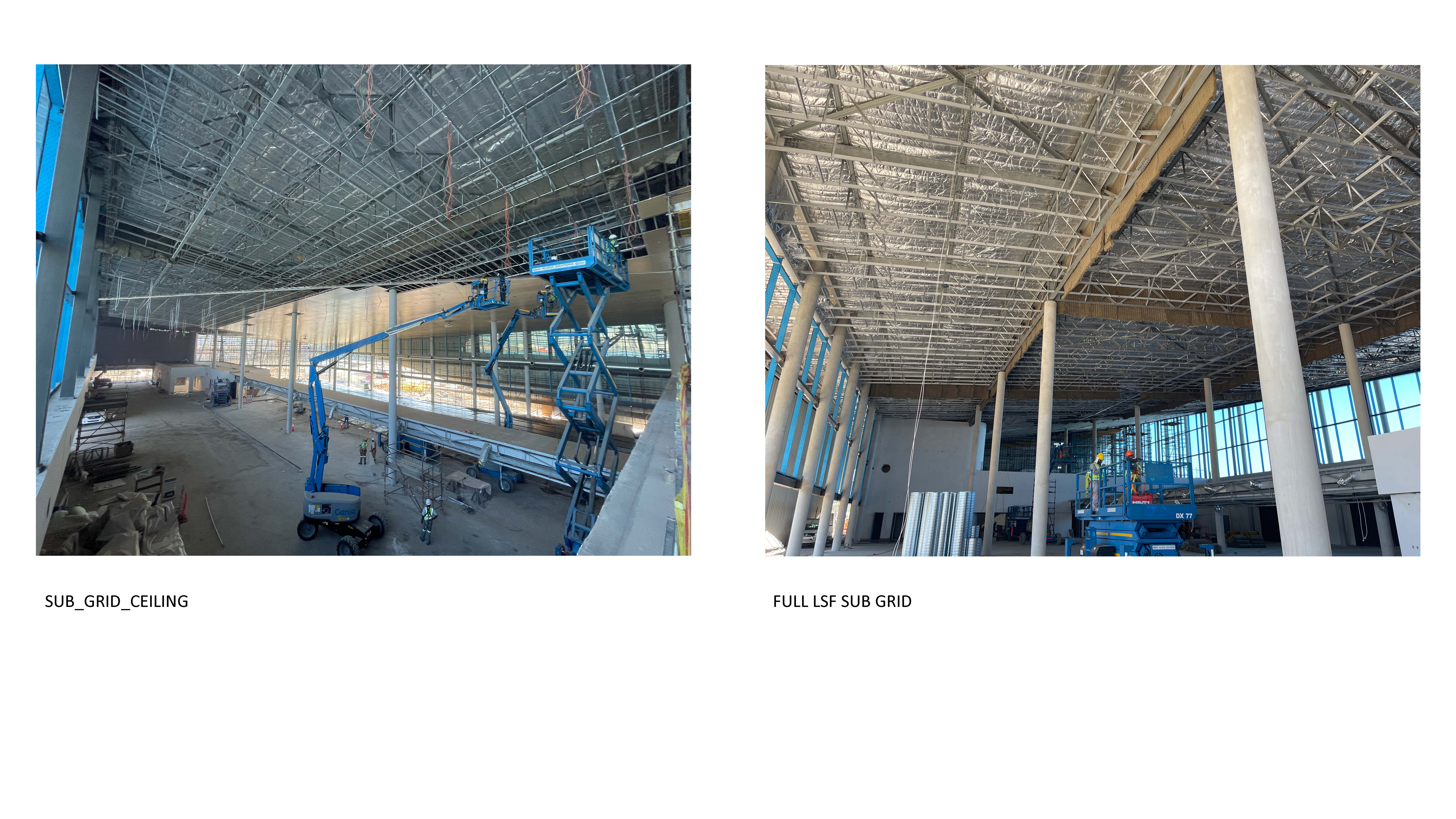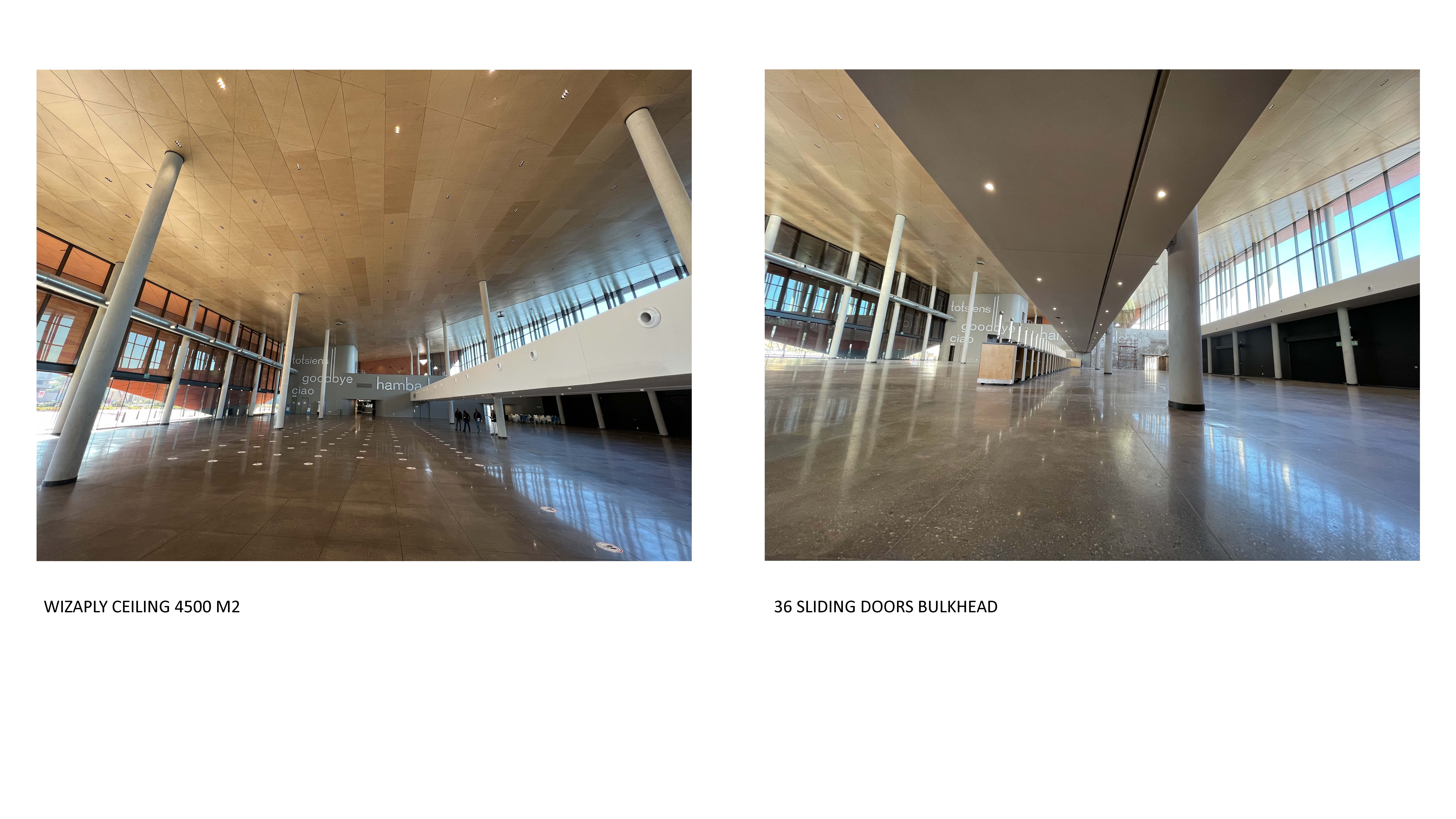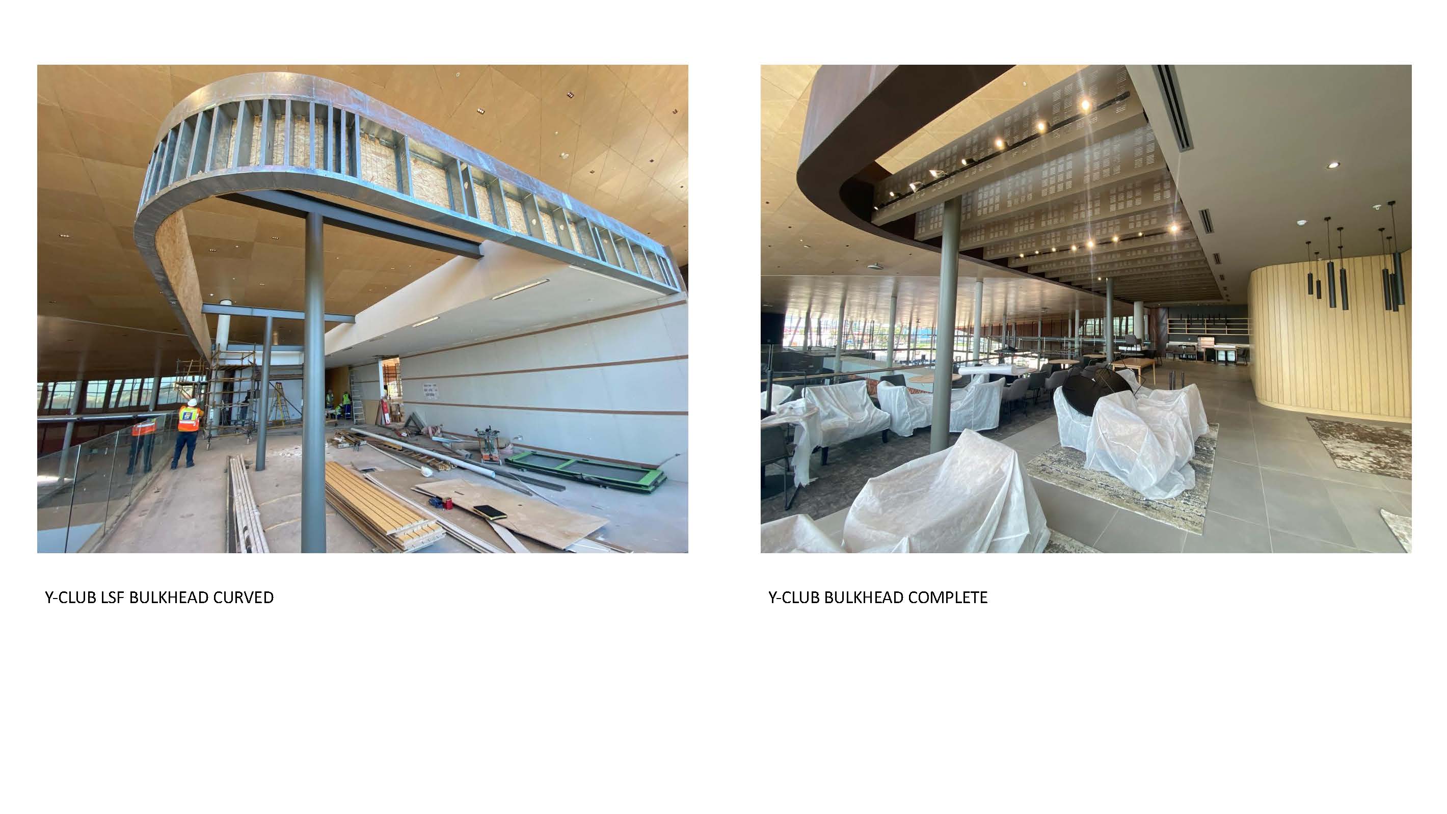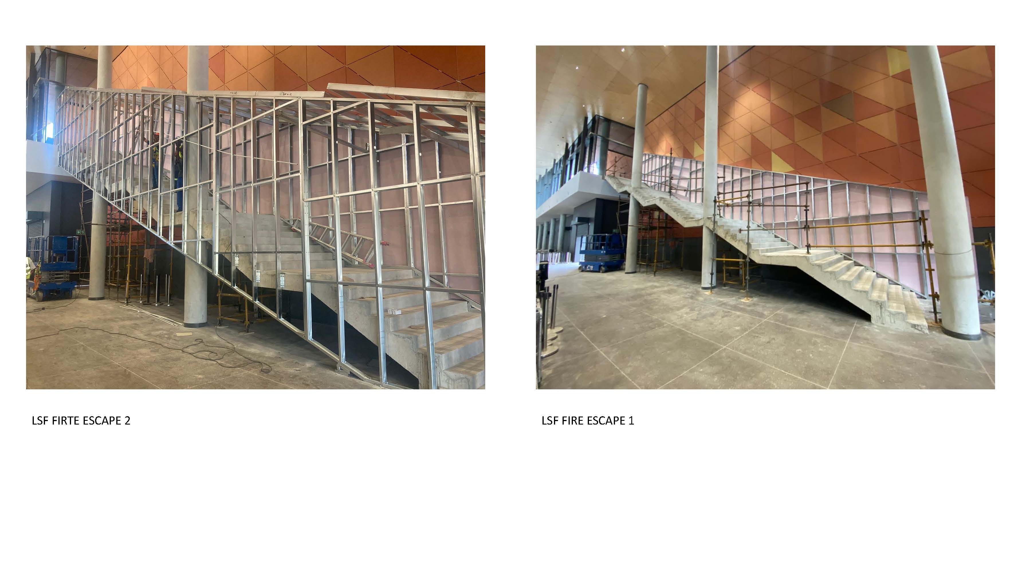 • Light steel frame 90x40x0,9m LSF sub grid 10 KM of steel 4500m2 The terminal's steel-intensive construction presented a host of logistical challenges. Installing the massive box girders that formed the cantilever required specialised rigging equipment and careful alignment to integrate with the concrete "anvil" structure. Positioning the raking columns, each at a different angle, demanded meticulous precision to ensure a seamless fit with the primary roof framing. At height, the team utilised extensive scaffolding and high-reach machinery to safely manoeuvre and secure the steel components. Throughout, the need for exceptional coordination between trades was paramount, as any misalignment could jeopardise the building's structural integrity and weatherproofing. Overcoming these complexities, the contractors delivered an impressive steel installation.
