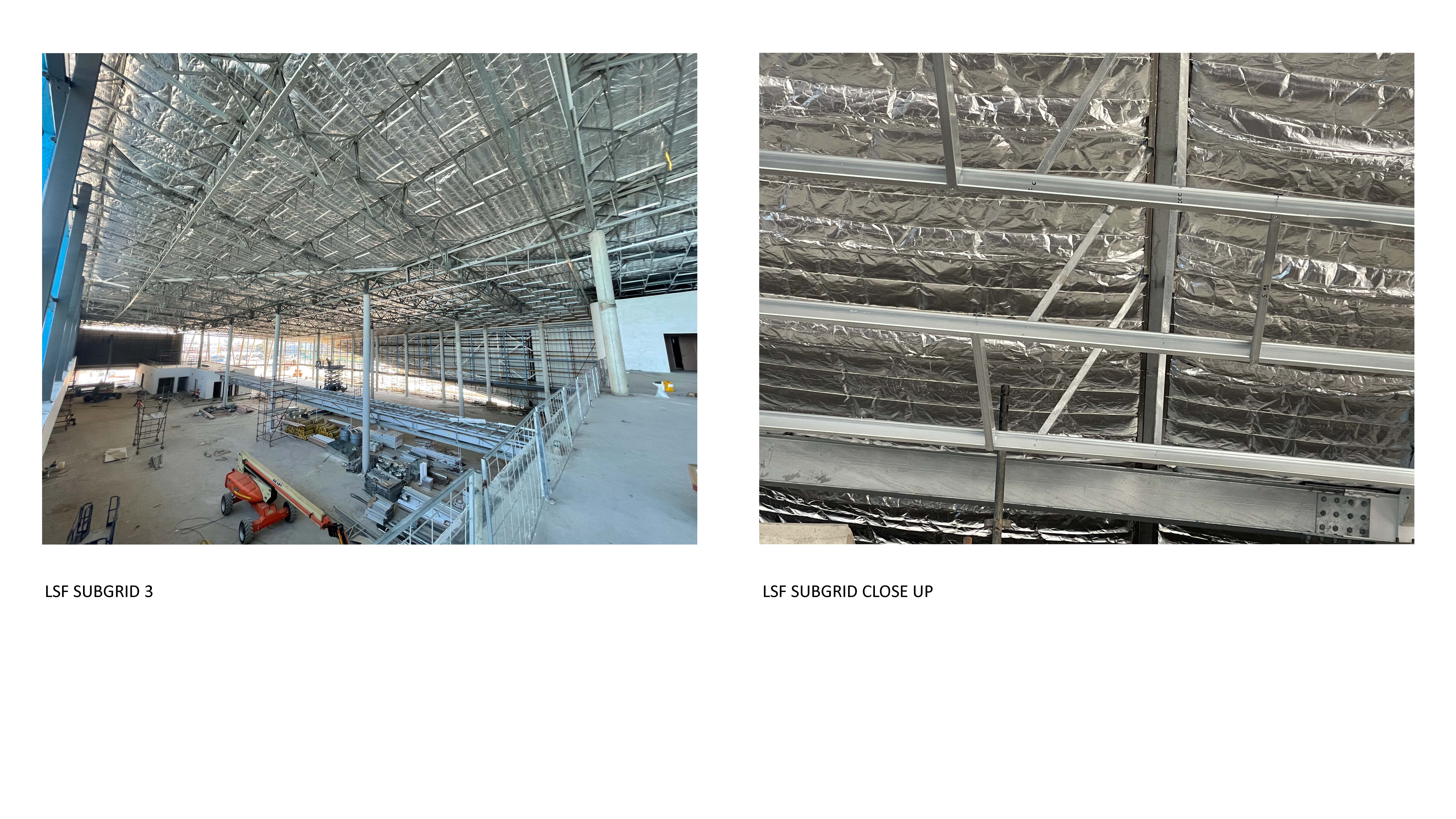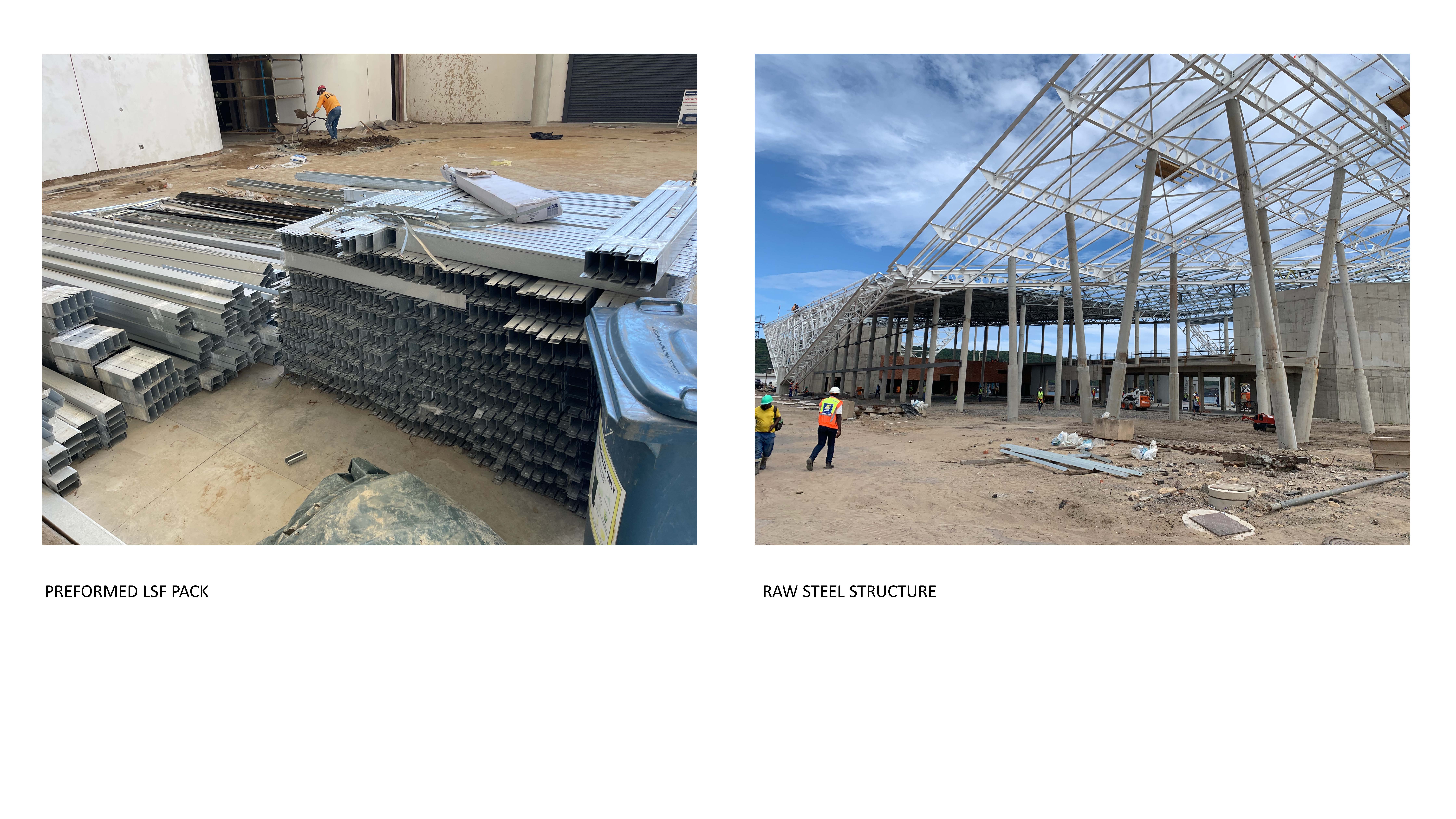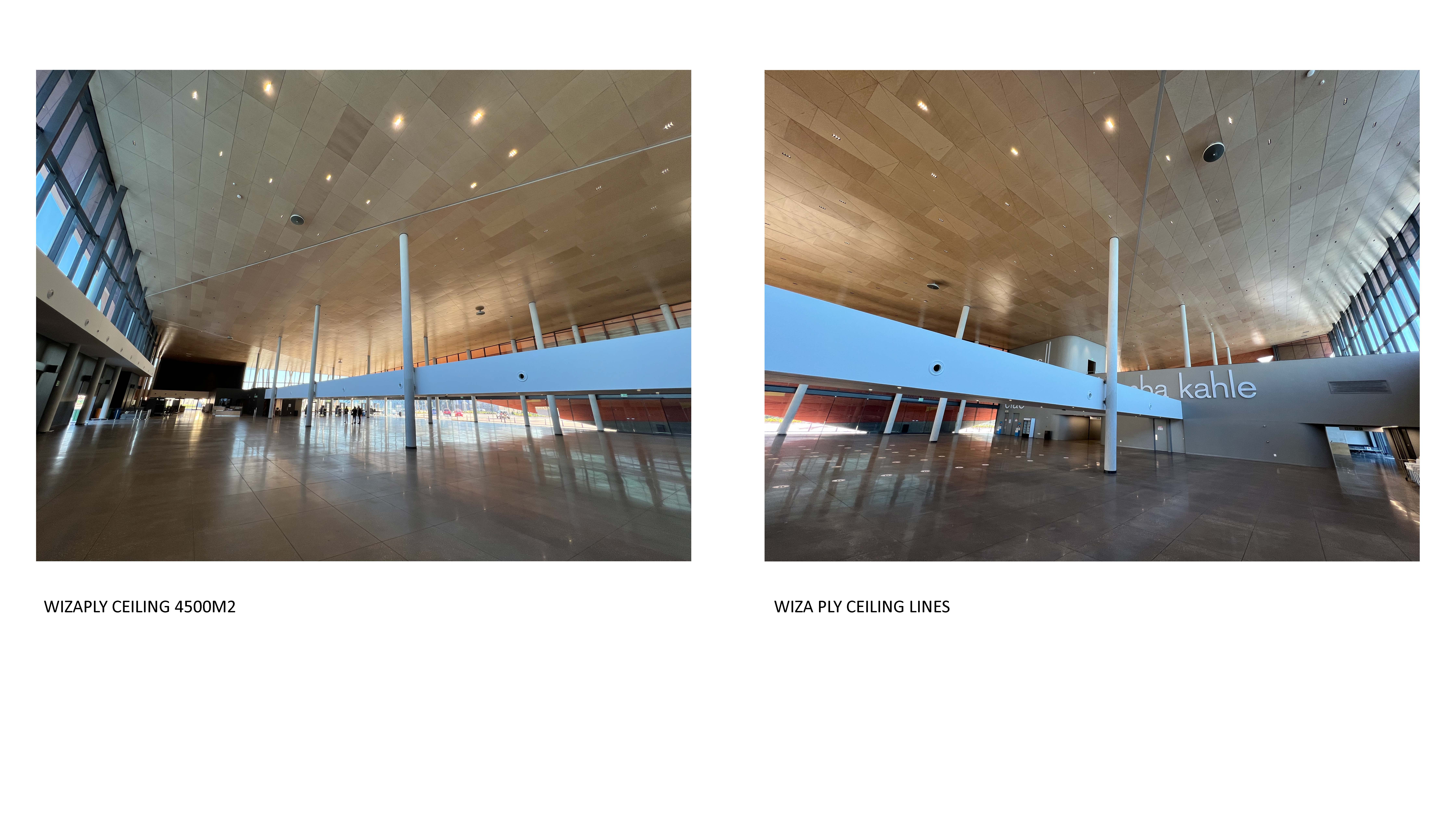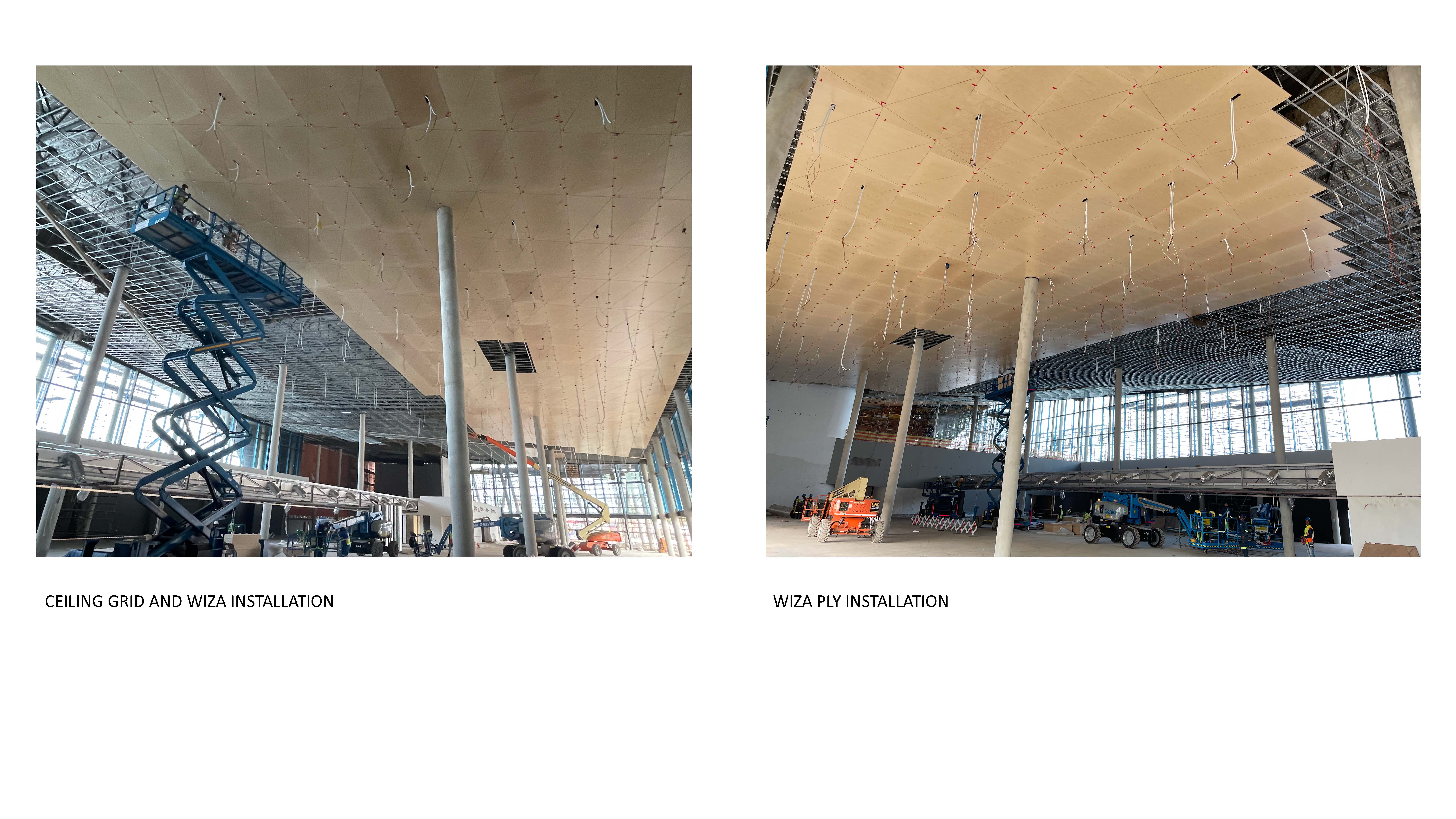 • Light steel frame 90x40x0,9m LSF sub grid 10 KM of steel 4500m2 The terminal's steel-intensive construction presented a host of logistical challenges. Installing the massive box girders that formed the cantilever required specialised rigging equipment and careful alignment to integrate with the concrete "anvil" structure. Positioning the raking columns, each at a different angle, demanded meticulous precision to ensure a seamless fit with the primary roof framing. At height, the team utilised extensive scaffolding and high-reach machinery to safely manoeuvre and secure the steel components. Throughout, the need for exceptional coordination between trades was paramount, as any misalignment could jeopardise the building's structural integrity and weatherproofing. Overcoming these complexities, the contractors delivered an impressive steel installation.