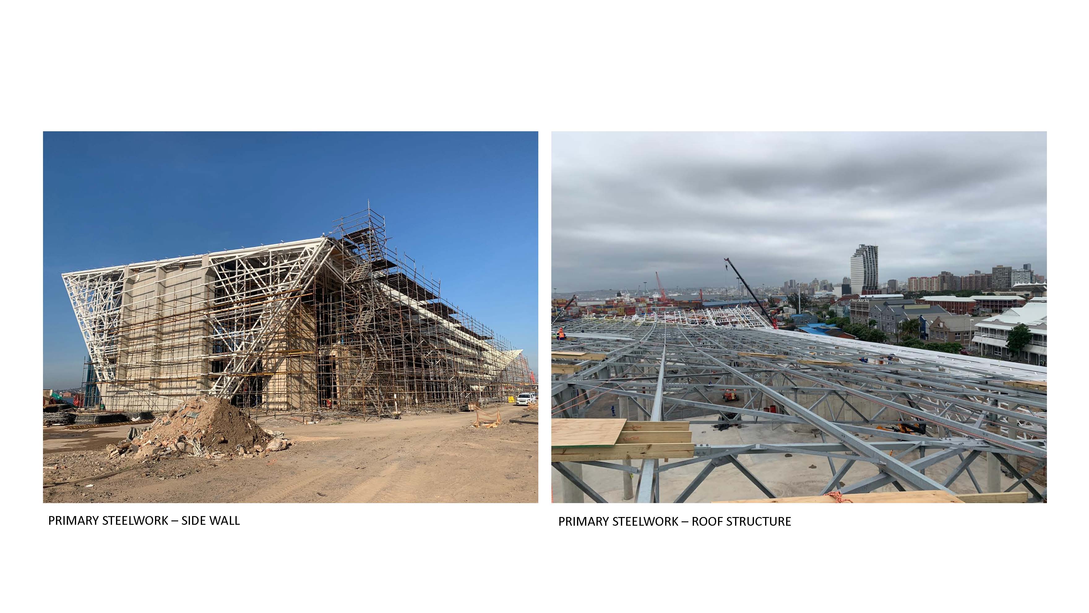The Nelson Mandela Cruise Terminal in South Africa is an impressive feat of steel engineering. Utilising over 3,200 tonnes of structural steel, the building features a complex roof design with a 105-metre unbalanced cantilever supported by an innovative "anvil" concrete structure. Slender circular columns, shear walls and a braced roof frame create the expansive 13-metre spans. Specialised steel sections like castellated beams add visual interest. Externally, a parametric facade of over 12,000 sq.m is clad in a bespoke steel-framed equitone system, wrapping the landmark building in a cohesive, sculptural envelope.