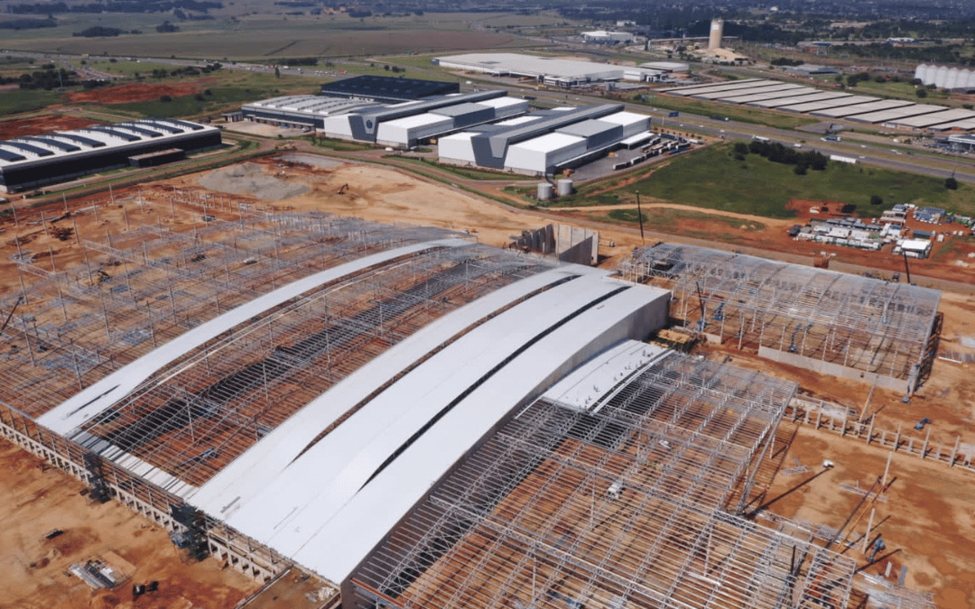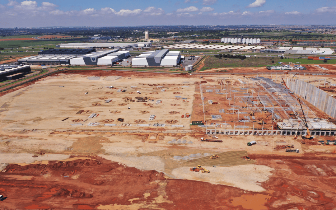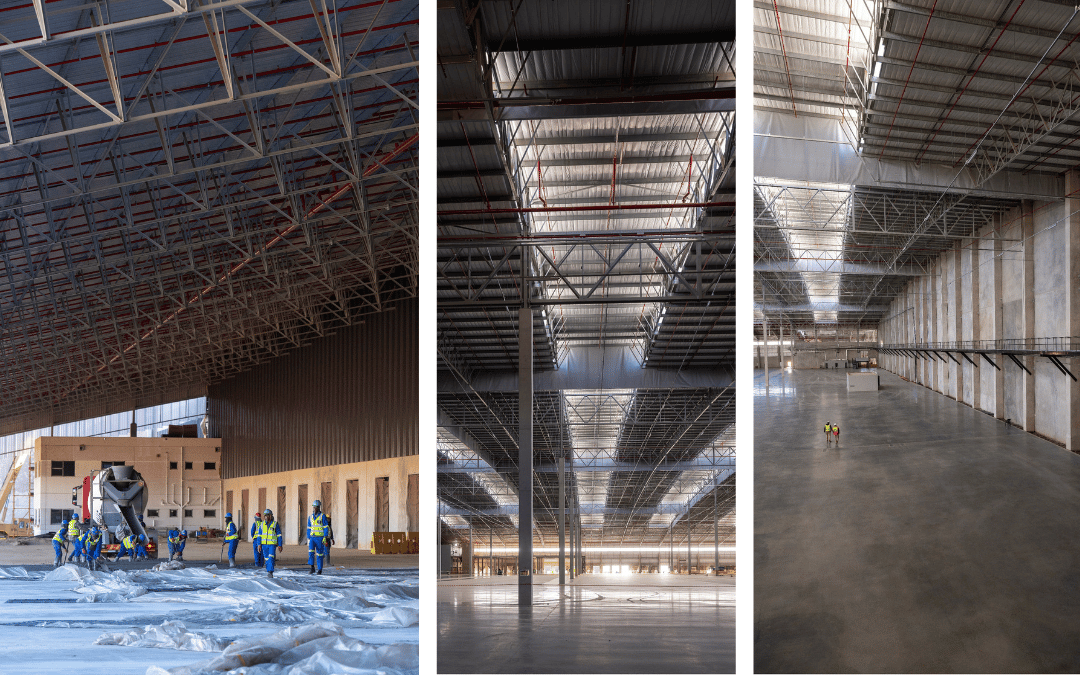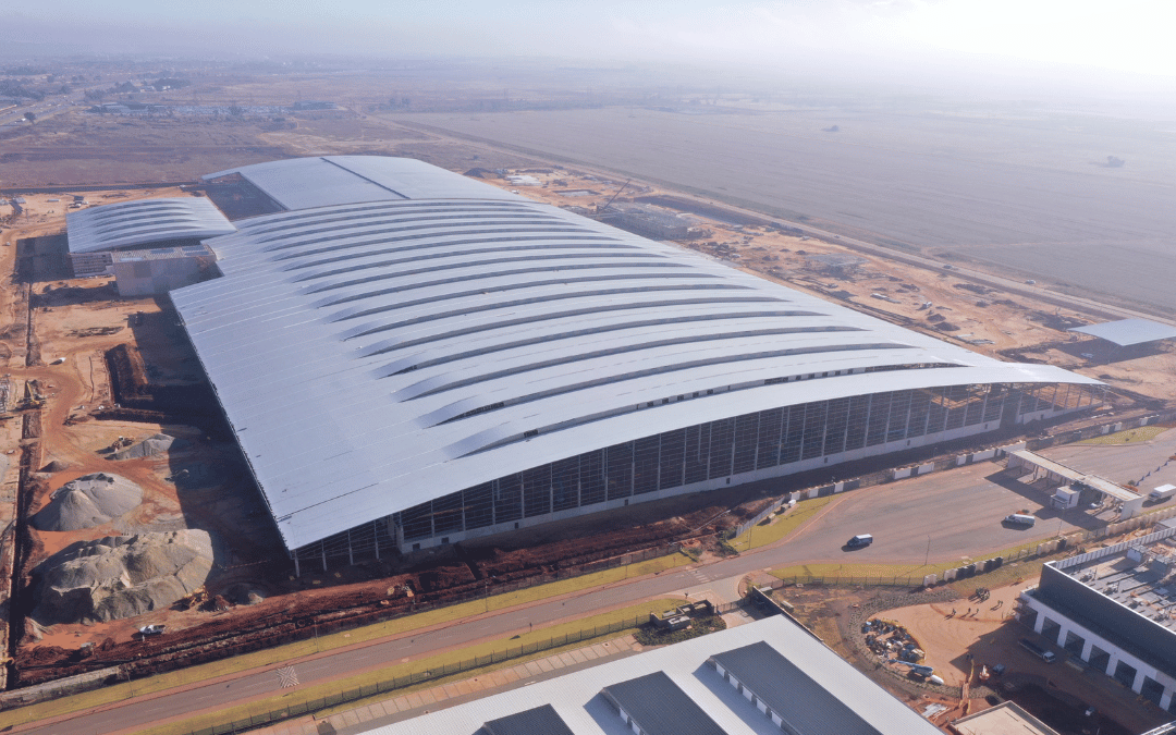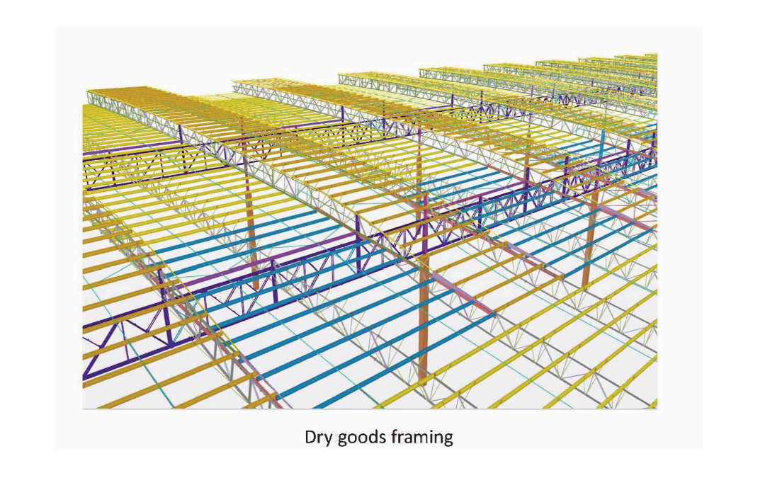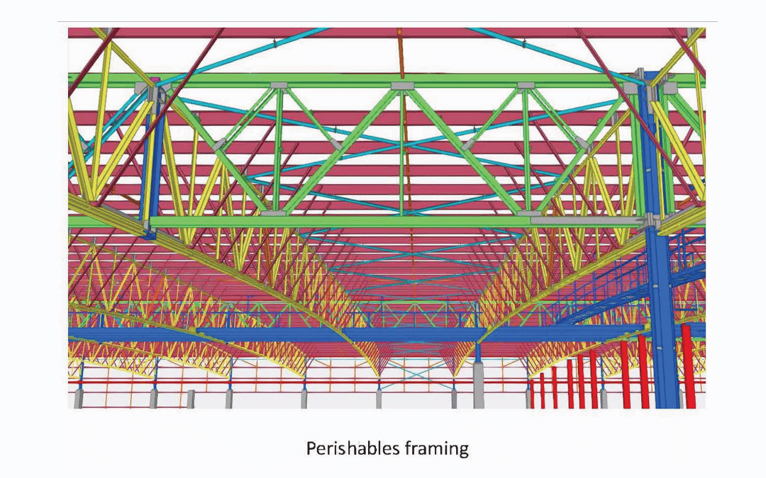 The Pick ‘n Pay DC is the largest logistics development agreement to date at the Eastport Logistics Park, near OR Tambo International Airport, Gauteng. The goal of the new distribution centre is to make Pick n Pay’s supply chain more centralised and aid in fulfilling its customer value project. It also offers 50% more capacity than the current Longmeadow facility. It is the largest single-phase warehousing development in South Africa. This 165,000m² structure includes an ambient environment building (Dry Goods) of 94,000m², a cold storage building (Perishables) of 46,000m² and a returnable building (RRU) of 25,000m². The Dry Goods building would house approximately 14 rugby fields under its massive roof which spans approx. 280m and its widest part of the building. The main structural frame is a double portal system where trusses & lattice girders were designed as part of portal frames to provide stability in two directions.Trusses occur at 8.175m centres and lattice girders occurs every 32.2m. Internal column grid is therefore 32.1m x 32.7m. Trusses for the Dry Goods and RRU Warehouse are 1.9m deep and lattice girders are 3.4m deep. The Perishables Warehouse has an insulated ceiling below the steel frame and all trusses and lattice girders are 2.4m deep to allow for maintenance to occur within the ceiling void. The Perishables Warehouse roof structure was designed to support heavy cooling units. There are 80 cooling units of 1700kg and 24 cooling units of 1100kg suspended from the steel roof structure – A total of 162 tons of cooling units are suspended from the steel roof structure. Dry Goods Warehouse has the highest apex of 25m and is the biggest warehouse at the Pick ‘n Pay site, with plan dimensions of 279m wide and 411m long.