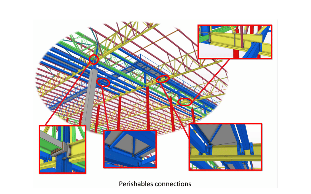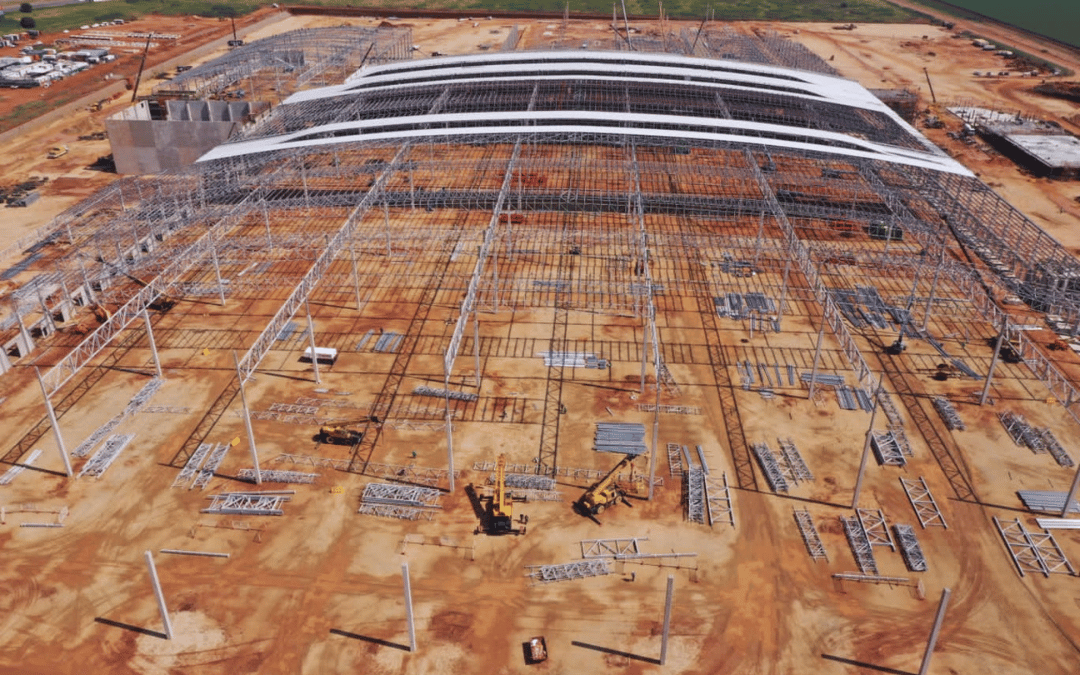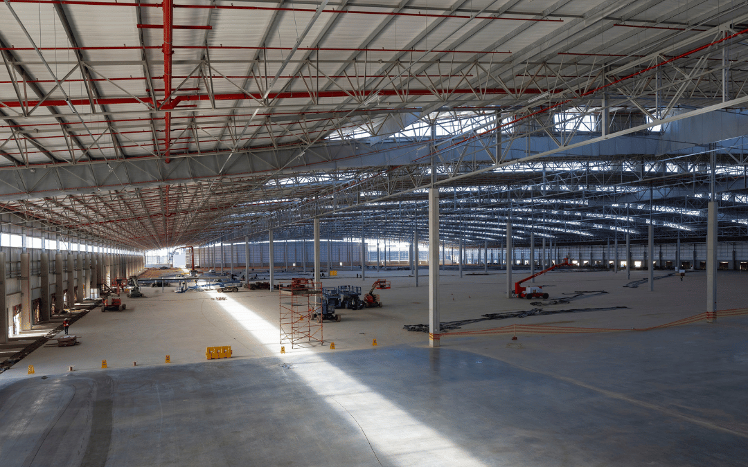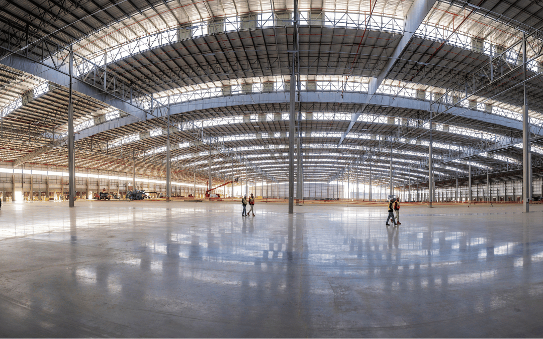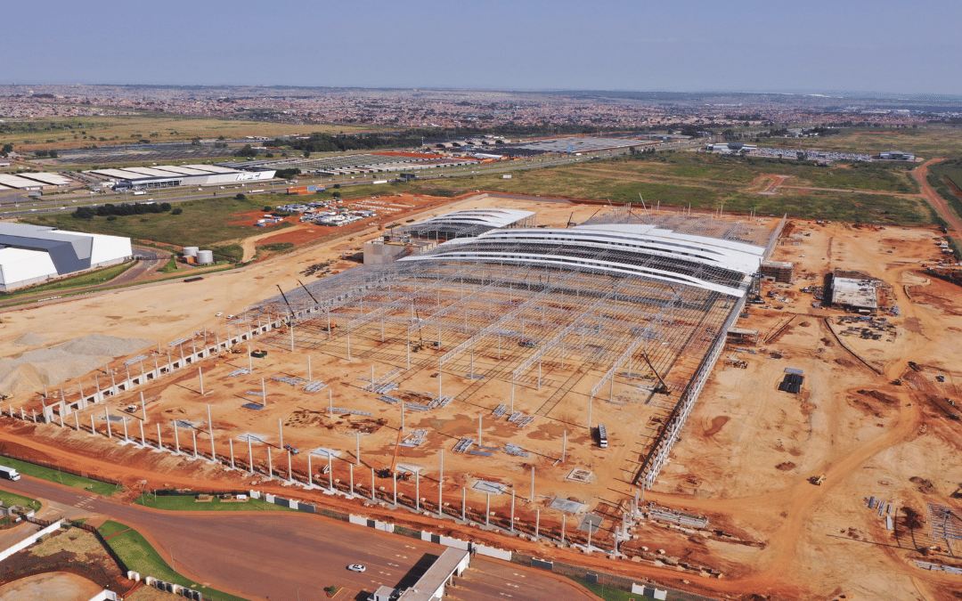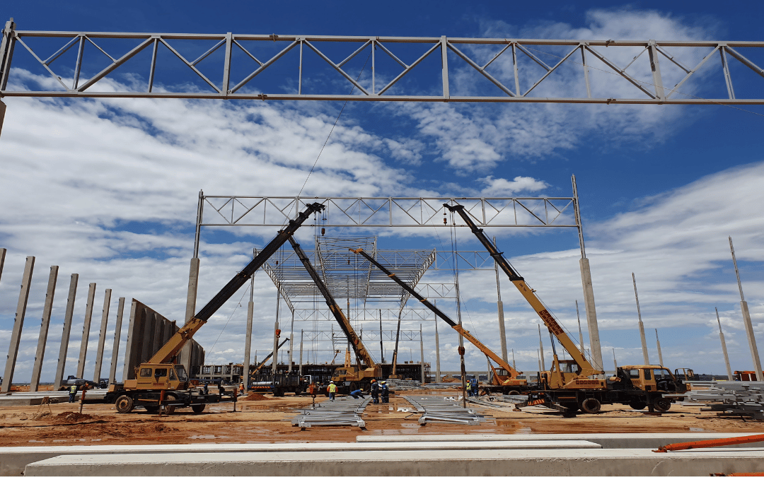 The Pick ‘n Pay DC is the largest logistics development agreement to date at the Eastport Logistics Park, near OR Tambo International Airport, Gauteng. The goal of the new distribution centre is to make Pick n Pay’s supply chain more centralised and aid in fulfilling its customer value project. It also offers 50% more capacity than the current Longmeadow facility. It is the largest single-phase warehousing development in South Africa. This 165,000m² structure includes an ambient environment building (Dry Goods) of 94,000m², a cold storage building (Perishables) of 46,000m² and a returnable building (RRU) of 25,000m². The Dry Goods building would house approximately 14 rugby fields under its massive roof which spans approx. 280m and its widest part of the building. The main structural frame is a double portal system where trusses & lattice girders were designed as part of portal frames to provide stability in two directions.Trusses occur at 8.175m centres and lattice girders occurs every 32.2m. Internal column grid is therefore 32.1m x 32.7m. Trusses for the Dry Goods and RRU Warehouse are 1.9m deep and lattice girders are 3.4m deep. The Perishables Warehouse has an insulated ceiling below the steel frame and all trusses and lattice girders are 2.4m deep to allow for maintenance to occur within the ceiling void. The Perishables Warehouse roof structure was designed to support heavy cooling units. There are 80 cooling units of 1700kg and 24 cooling units of 1100kg suspended from the steel roof structure – A total of 162 tons of cooling units are suspended from the steel roof structure. Dry Goods Warehouse has the highest apex of 25m and is the biggest warehouse at the Pick ‘n Pay site, with plan dimensions of 279m wide and 411m long.