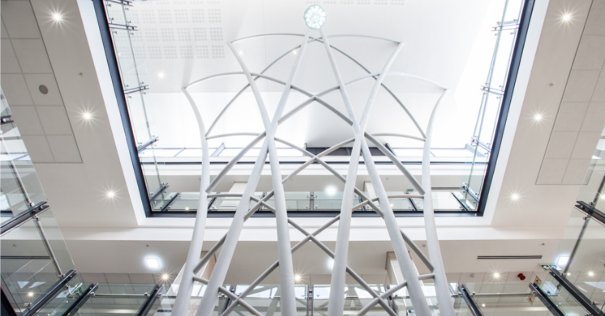 But this is the second decade of the 21st century. Some wide awake tube manufacturers and steelwork fabricators are keeping up with modern developments and over the last 5 years we find that numerous NC controlled laser cutting machines have made Tubular ‘boat shaped’ trusses under fritted glass. their way to the foot of Africa and now, all that is rapidly changing.