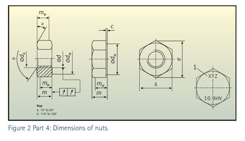 Clause 3: Dimensional information; specifying the bolts and nuts and their associated standards; proof loads for nuts; hardness of nuts; marking of bolts and nuts.